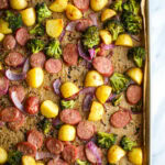 I really enjoy chicken sausage for sheet pan dinners to avoid overcooking the veggies while trying to make sure the meat gets to temperature since chicken sausage is fully cooked.