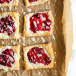 These Cherry Cheese Danish are everything you expect made simple at home. Flaky puff pastry is topped with a lightly sweetened cream cheese mixture and nostalgic cherry pie filling. Finish with a simple vanilla glaze, and you have a treat that tastes like you spent hours on them!